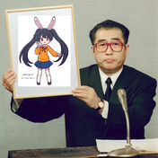 - ウサギの女の子「パシフィカちゃん」の額縁を持ち上げている小渕恵三さん